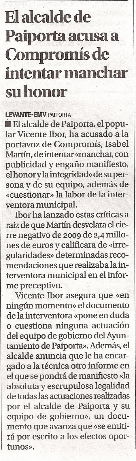 La regidora de Compromís per Paiporta, Isabel Martín, lamenta que l’alcalde Ibor “carregue contra mi per tractar d’ocultar la seva pèssima gestió en l’Ajuntament de Paiporta, gestió que ha dut a aquest Ajuntament a tindre un romanent negatiu de tresoreria de 2’5 milions d’euros quan fa menys d’un any es va formalitzar un préstec de quasi 4 milions d’euros per a fer front al romanent anterior”.