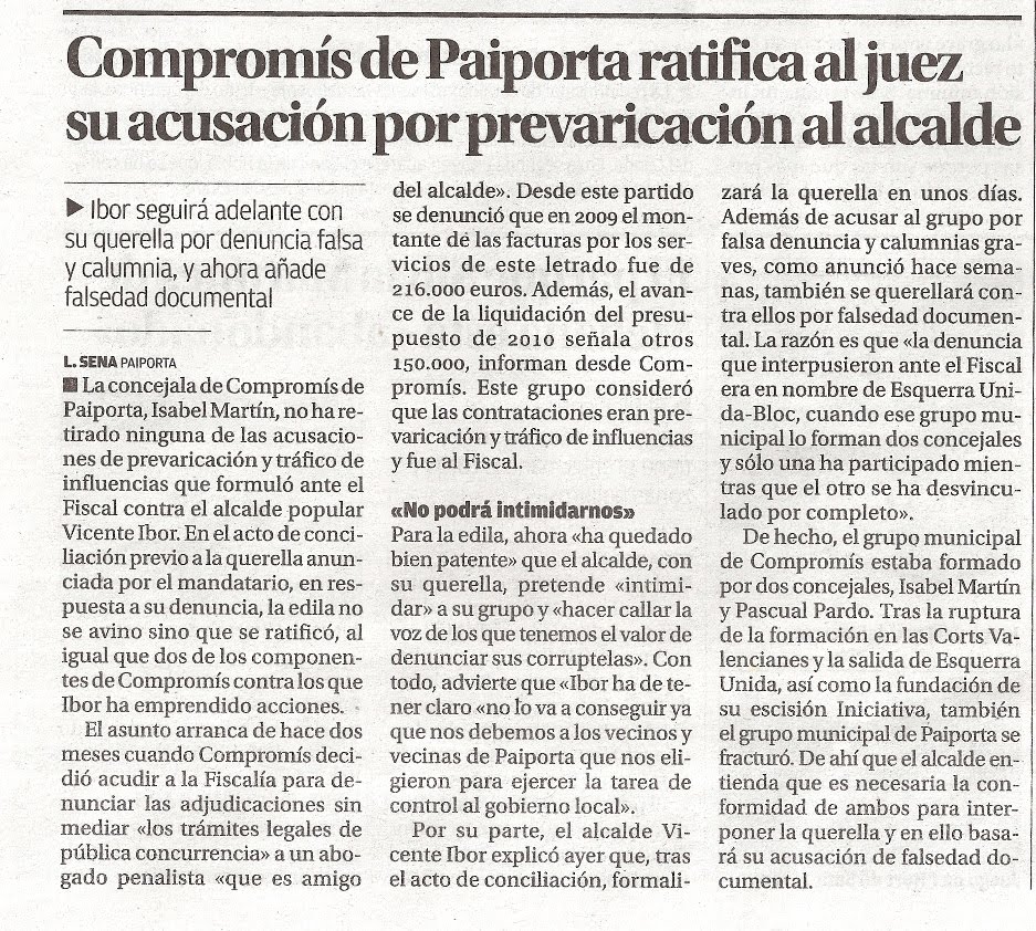 Nota Premsa Levante: COMPROMÍS RATIFICA AL JUEZ SU ACUSACIÓN POR PREVARICACIÓN AL ALCALDE