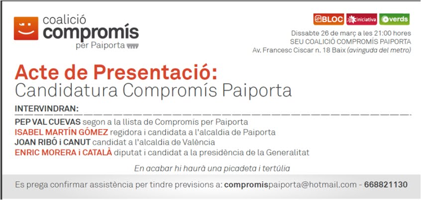 El proper dissabte 26 de març fem la presentació de la Candidatura de Compromís a Paiporta per a les properes eleccions municipals del mes de maig. L’acte serà a les 21:00 a la nostra seu (Avgda. Francesc Císcar, 18 – carrer del metro). Adjuntem invitació.